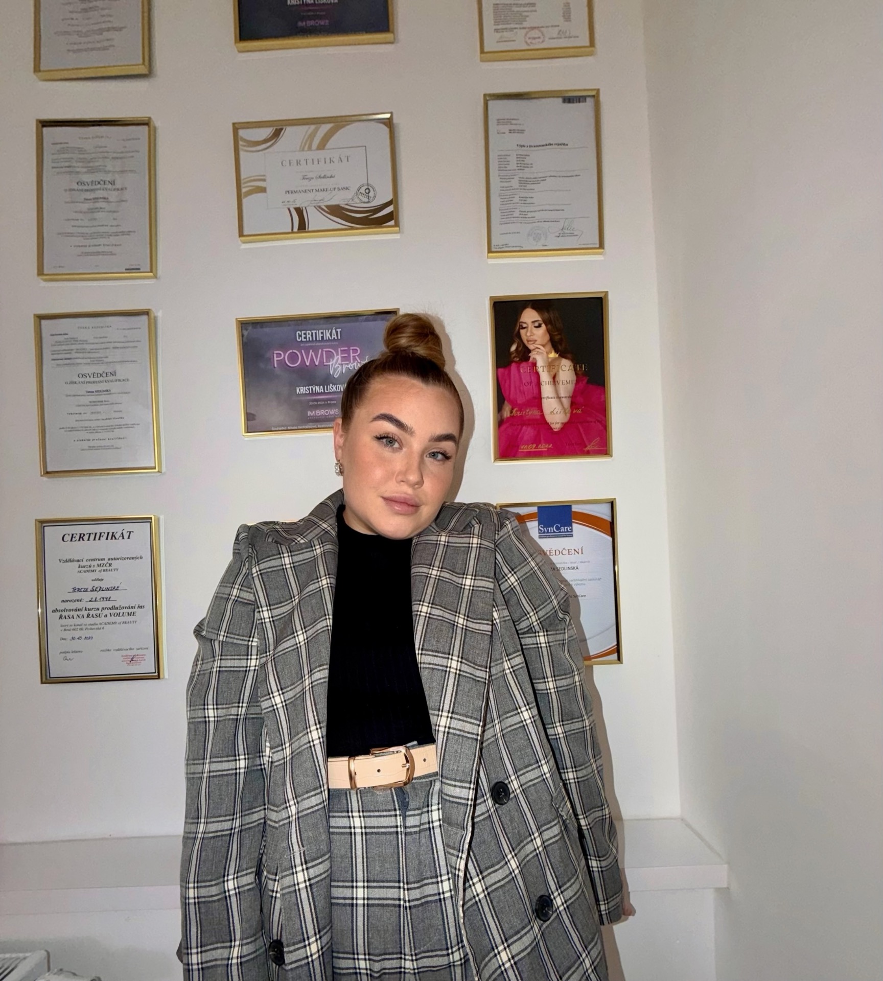 Jmenuji se Kristýna. Vystudovala jsem obor kosmetička-vizážistka v Brně na Charbulově. Momentálně mám 2 provozovny. První se nachází v Brně na ulici Příkop 6, a ta druhá je v obci v Zastávce u Brna, na ulici 1. Máje 2. Mám za sebou spoustu akreditovaných kurzů jako například porucha integrity kůže, kam spadá (permanent, BB - glow a mezoterapie) a mnohé dálší. Má práce je mým koníčkem, což určitě hned poznáte, jak mě uvidíte. Jsem přátelská a velice, opravdu velice komunikativní (smích) - takže nuda určitě nebude.